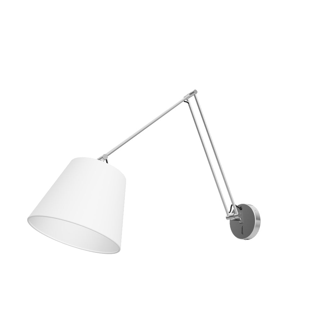 Wandleuchte mit Doppelarm,Textilschirm und Schalter an der Basis.