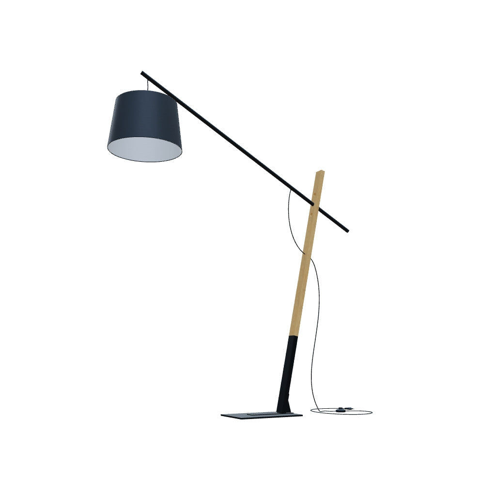 Massive Stehleuchte für geräumige Innenräume. Kombination aus Holz, Metall und Textilschirm.
