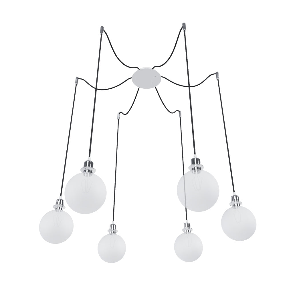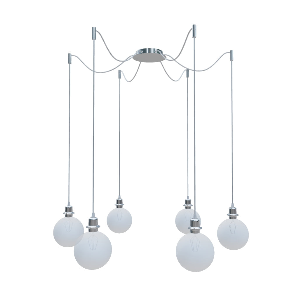 Pendelleuchte mit zentraler Deckenbasis und sechs Textilsarmen mit Metallsockel zur Deckenbefestigung, E27-Fassung zur Verwendung mit geeigneten Textilschirmen. Das Stoff-Pendelset wird mit vechromten Deckenhaltern geliefert, die in einem individuellen Abstand von der Basis installiert werden können. Kabellänge 3 m.