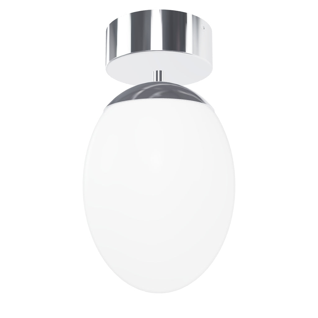 Ovale Deckenleuchte aus Glas mit einer Chrombasis. Geeignet für feuchte Umgebungen.