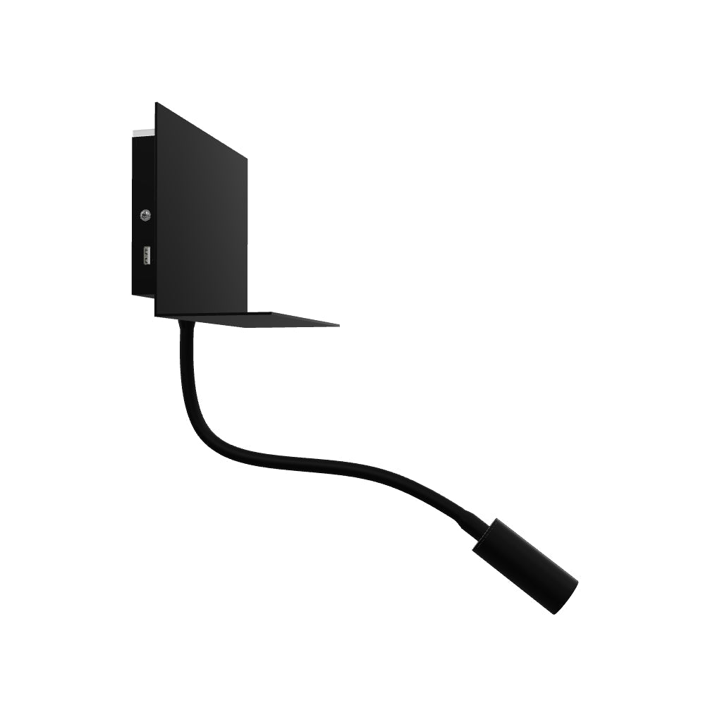 LED-Wandleuchte mit einem Fach zur Aufbewahrung des Telefons und mit einem integrierten USB-Anschluss. Der LED-Strahler am flexiblen Hals und die indirekte Beleuchtung werden separat über zwei Schalter gesteuert.