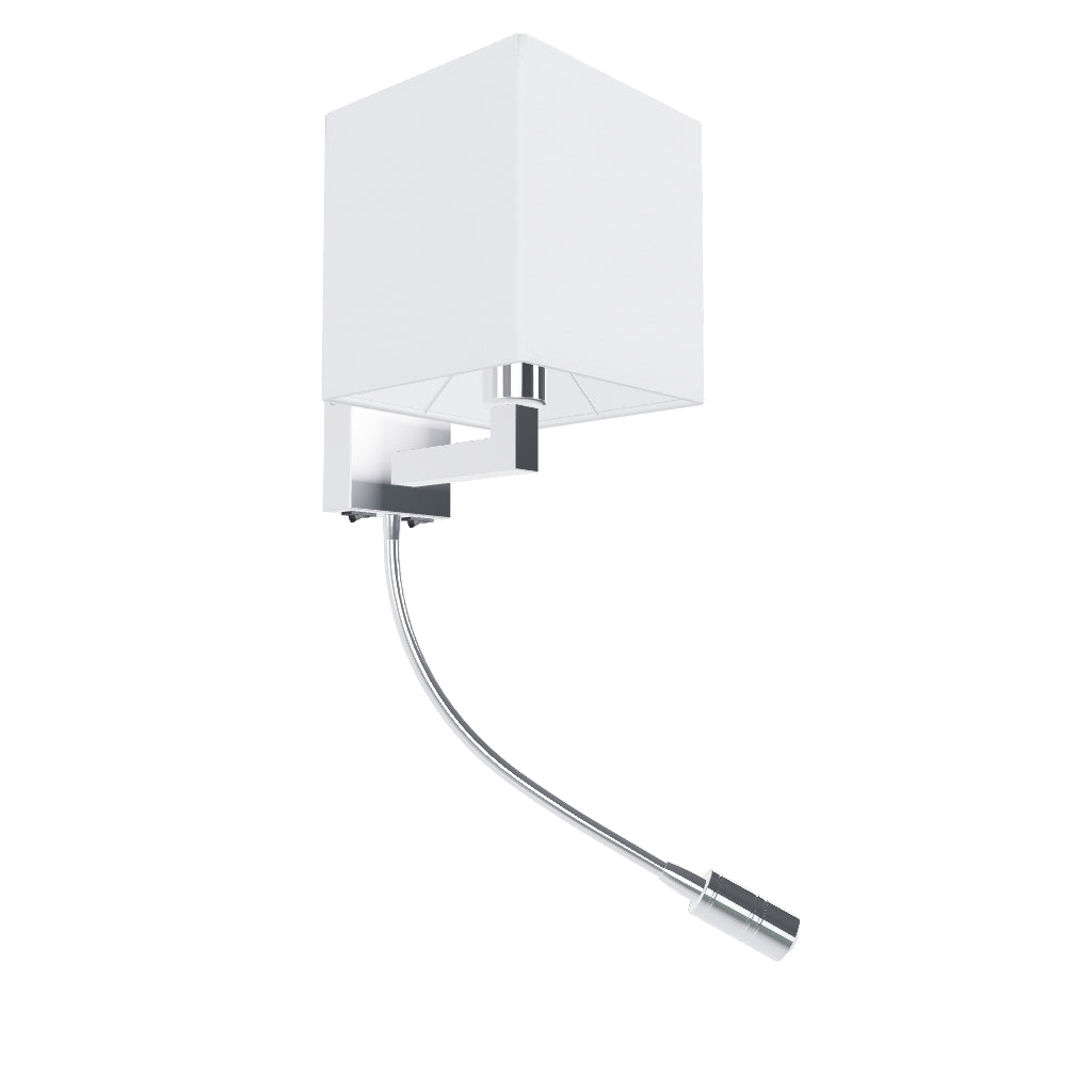 Wandleuchte mit Textilschirm, ergänzt durch einen flexiblen Arm mit LED-Diodenreflektor. Die Leuchte verfügt über zwei Lichtquellen, die separat über Schalter an der Basis gesteuert werden können.