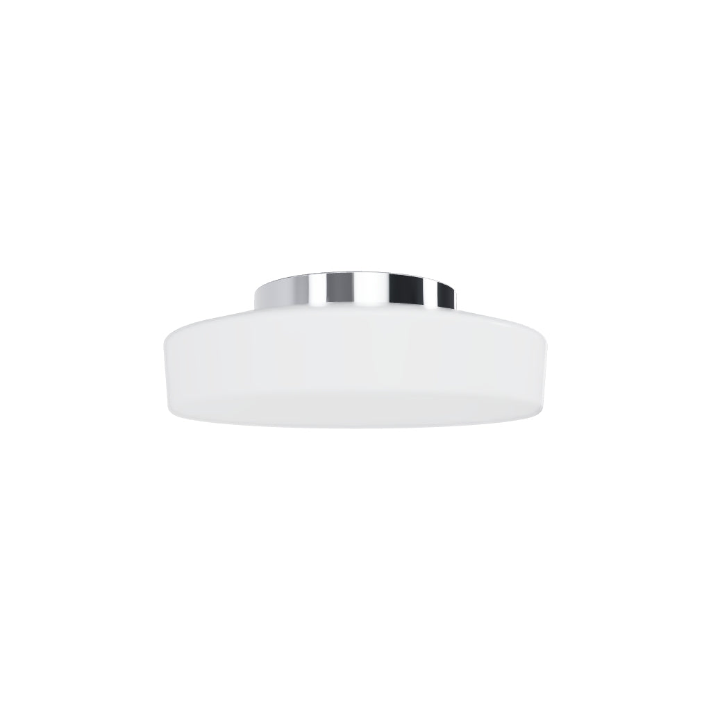 LED-Deckenleuchte aus Opalglas auf Chrombasis für feuchte Umgebungen.